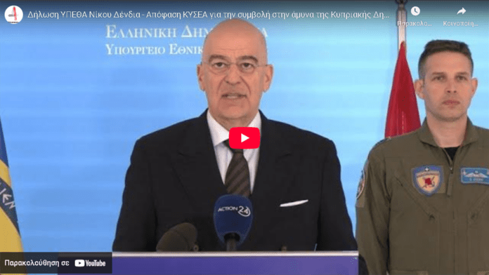 Δήλωση Υπουργού Εθνικής Άμυνας Νίκου Δένδια – Απόφαση ΚΥΣΕΑ για την συμβολή στην άμυνα της Κυπριακής Δημοκρατίας, αποστέλετε η νέα φρεγάτα ΚΙΜΩΝ μαζί με μία ακόμα φρεγάτα που θα φέρει το σύστημα ΚΕΝΤΑΥΡΟΣ, ζεύγος μαχητικών αεροσκαφών F 16 – Μεταβαίνει στην Κύπρο με τον ΓΕΕΘΑ!