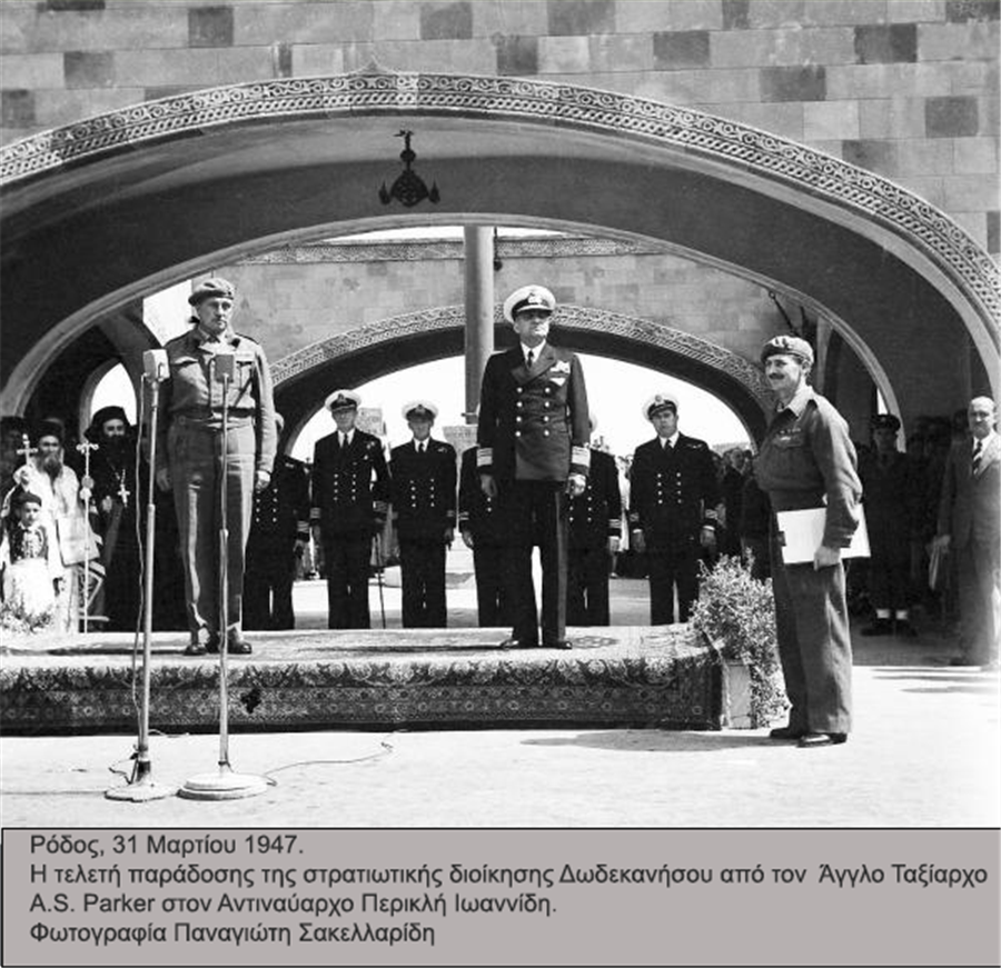 Κατά τη διάρκεια του Β΄ Παγκοσμίου Πολέμου και μετά τη συνθηκολόγηση των Ιταλών (1943), οι Γερμανοί έγιναν κύριοι των Δωδεκανήσων. Μετά την κατάρρευση της χιτλερικής Γερμανίας (Μάιος 1945), η Μεγάλη Βρετανία ανέλαβε την διοίκηση. Στις 10 Φεβρουαρίου 1947 υπογράφηκε στο Παρίσι η Συνθήκη Ειρήνης με την Ιταλία, σύμφωνα με την οποία τα Δωδεκάνησα αποδίδονταν στην Ελλάδα. Η τελετή παράδοσης των Δωδεκανήσων στην Ελλάδα από τις βρετανικές αρχές έλαβε χώρα στις 31 Μαρτίου 1947, στη Ρόδο, μέσα σε πανηγυρική ατμόσφαιρα. Την ημέρα εκείνη, ο Άγγλος Ταξίαρχος Parker υπέγραψε το πρωτόκολλο παράδοσης. Πρώτος διοικητής των Δωδεκανήσων ανέλαβε ο Αντιναύαρχος Περικλής Ιωαννίδης, με πολιτικό σύμβουλο τον Μιχαήλ Στασινόπουλο, μετέπειτα Πρόεδρο της Ελληνικής Δημοκρατίας.