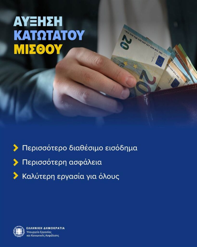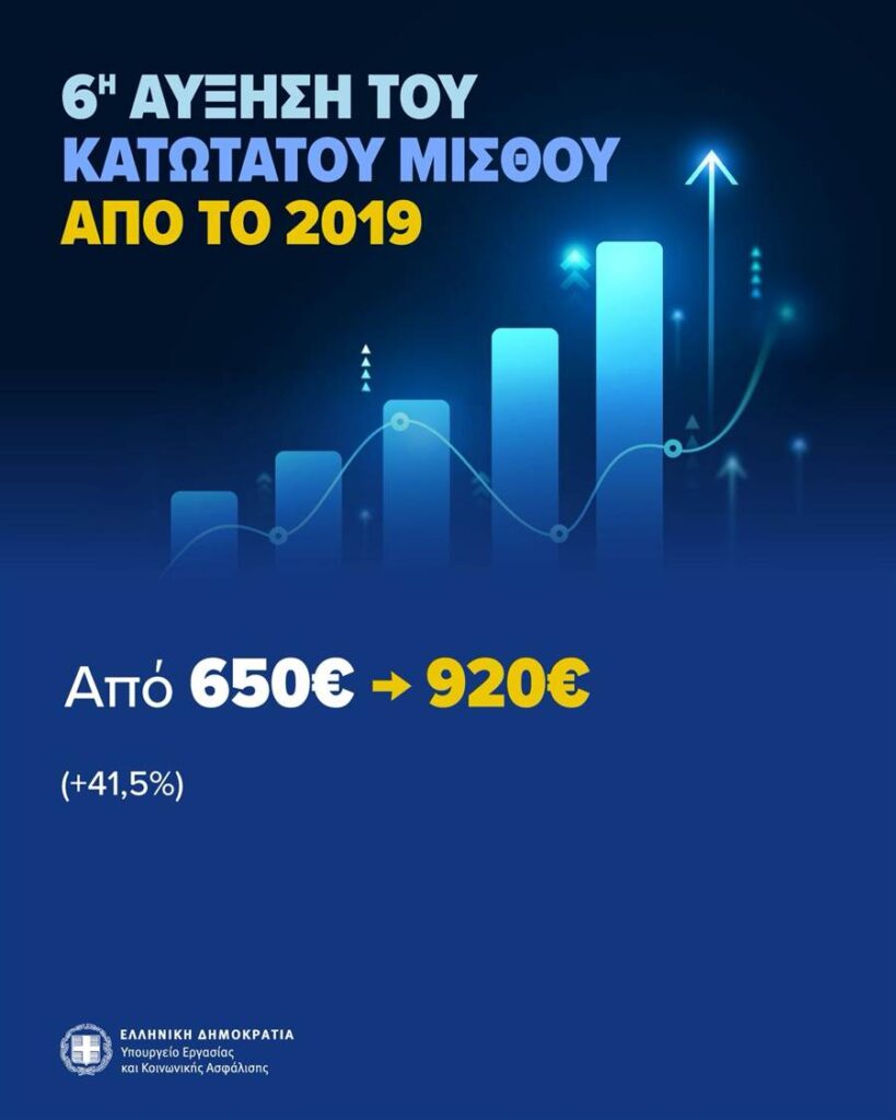 Η Υπουργός Εργασίας και Κοινωνικής Ασφάλισης, Νίκη Κεραμέως, δήλωσε: «Από την 1η Απριλίου, ο κατώτατος μισθός αυξάνεται για έκτη διαδοχική φορά, διαμορφούμενος στα 920 ευρώ, καταγράφοντας συνολική αύξηση 41,54% σε σχέση με το 2019. Στόχος μας είναι η ουσιαστική ενίσχυση του διαθέσιμου εισοδήματος των πολιτών, εντός των αντοχών της οικονομίας και του δημόσιου δημοσιονομικού. Παράλληλα, η νέα δυναμική σύναψης Συλλογικών Συμβάσεων Εργασίας κατ’ εφαρμογή της Εθνικής Κοινωνικής Συμφωνίας που ήδη αγγίζουν 500.000 εργαζομένους, η αύξηση αποδοχών εργαζομένων ως αποτέλεσμα της εφαρμογής της Ψηφιακής Κάρτας Εργασίας, καθώς και η μείωση της ανεργίας στο χαμηλότερο επίπεδο των τελευταίων 18 ετών, συνθέτουν ένα συνεκτικό πλέγμα πολιτικών που ενισχύει την εργασία και το διαθέσιμο εισόδημα».