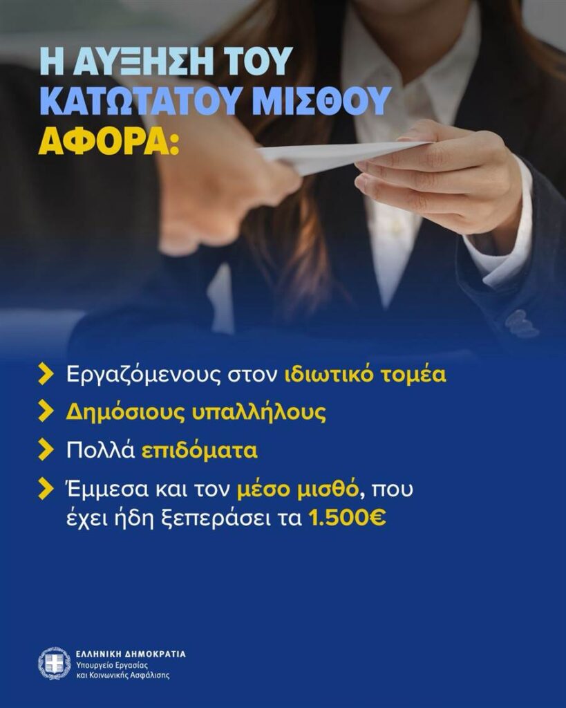 Από την αύξηση του κατώτατου μισθού και ημερομισθίου επηρεάζονται άμεσα περίπου 700.000 θέσεις εργασίας στον ιδιωτικό τομέα, το σύνολο των δημοσίων υπαλλήλων, όσοι λαμβάνουν επιδόματα και παροχές που υπολογίζονται με βάση τον κατώτατο μισθό (π.χ. επίδομα μητρότητας, γονικής άδειας, ανεργίας), τριετίες, ενώ έμμεσα επηρεάζεται και ο μέσος μισθός, ο οποίος, σύμφωνα με τα στοιχεία της ετήσιας έκθεσης του συστήματος «ΕΡΓΑΝΗ» για το 2025 ανήλθε στα 1.516 ευρώ.