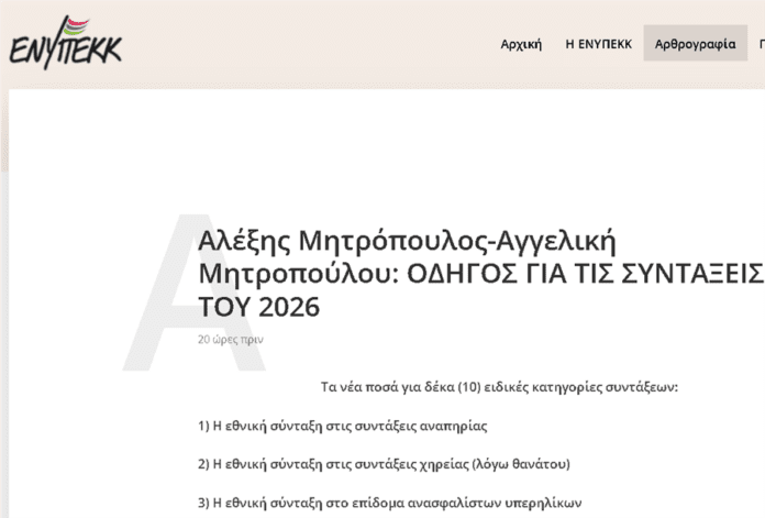 Διαβάστε ολόκληρη την ανάλυση-ΟΔΗΓΟ των Αλέξη και Αγγελικής Μητροπούλου και ενημερωθείτε για τα νέα ποσά της εθνικής σύνταξης και δέκα (10) ειδικών κατηγοριών συντάξεων όπως διαμορφώθηκαν και καταβάλλονται από 1-1-2026, εδώ: https://enypekk.gr/2026/01/17/alexis-mitropoulos-angeliki-mitropoulou-odigos-gia-tis-syntaxeis-tou-2026