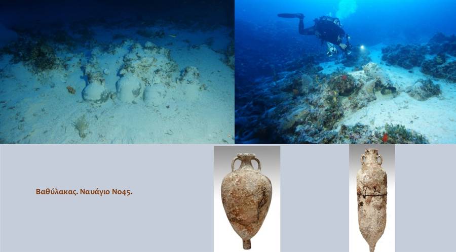 1. Ναυάγιο Νο. 45. Βρίσκεται σε βάθη -54 – -67μ., χρονολογείται στο α’ μισό του 4ου αιώνα μ.Χ. και σώζεται σε άρτια κατάσταση. Λόγω του μεγάλου βάθους, στο οποίο βρίσκεται, αποτελεί ένα από τα τελευταία παρθένα ναυάγια στο Αιγαίο. Το φορτίο του απαρτίζεται από αμφορείς που προέρχονται από τις ρωμαϊκές κτήσεις στη σημερινή Τυνησία, καθώς και από αμφορείς που παράγονται σε εργαστήρια της νότιας Ισπανίας. Το ναυάγιο φέρει ένα συμπληρωματικό φορτίο αμφορέων, που προέρχονται από εργαστήρια στην περιοχή της Καταλονίας, της Νότιας Ισπανίας και της Νότιας Πορτογαλίας, μαρτυρώντας τα εκτεταμένα εμπορικά δίκτυα της ύστερης ρωμαϊκής περιόδου.