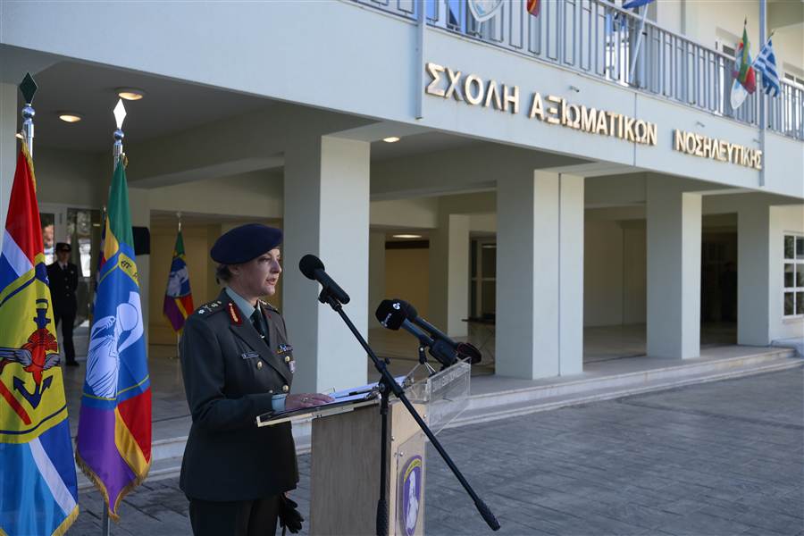 Αποτελεί και για μένα ιδιαίτερη τιμή η παρουσία μου σήμερα εδώ, στη Σχολή Αξιωματικών Νοσηλευτικής. Στο Ανώτατο Στρατιωτικό Εκπαιδευτικό Ίδρυμα, όπου η Υποναύαρχος (ΥΝ) Γλυκερία Μεμεκίδου ΠΝ και η Υποπτέραρχος (ΥΝ) Ευαγγελία Ανδρεαδάκη έλαβαν την ακαδημαϊκή και τη στρατιωτική τους εκπαίδευση. Η Σχολή στην οποία έδωσαν τον όρκο τους, και τον οποίο τήρησαν και τίμησαν.