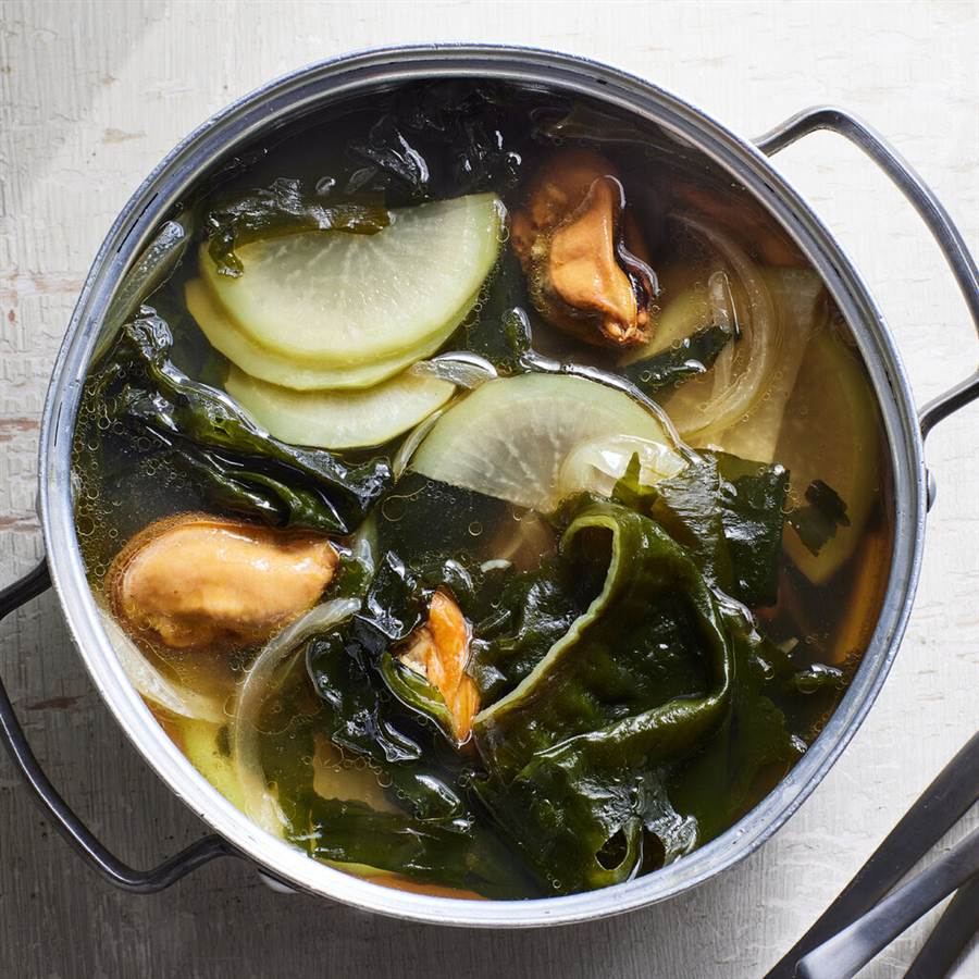 In Korean culture, people eat seaweed soup, or miyeok guk, on birthdays not just to celebrate their own birth, but also to show gratitude for their mothers. This version replaces the more common beef broth with one made from mussels, onion, garlic and anchovies. Scooped out of their shells, the mussels become little nuggets of briny joy.
