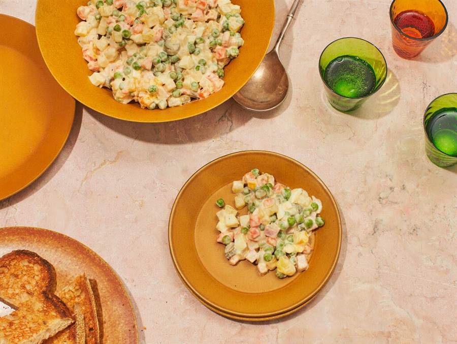 Russian salad, a vegetable-studded potato salad with mayonnaise, is a beloved traditional party dish that has been riffed on pretty much all over the world. This version, served at a Serbian restaurant in New York City, uses gherkins or cornichons for a savory taste.
