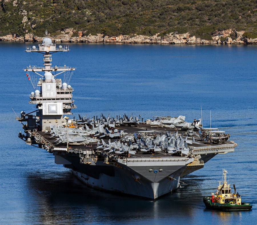 | The U.S.S. Gerald R. Ford aircraft carrier in the Mediterranean yesterday. Costas Metaxakis/Agence France-Presse — Getty Images |