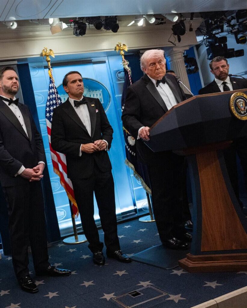 Many guests took cover on the ground. Gun-toting agents started running through the hallways outside the ballroom, screaming at people to get low. Caterers in white jackets cried out in terror as they bolted for cover in a stairwell. Security agents escorted out members of Trump’s cabinet. Trump, along with Vice President JD Vance and the first lady, Melania Trump, had taken their seats just a few minutes earlier.