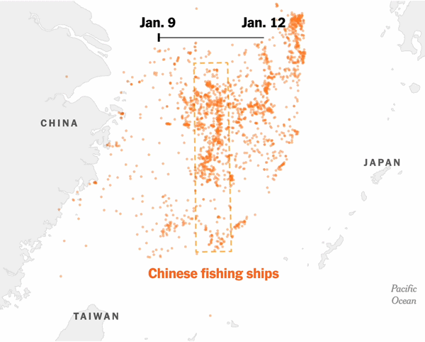 China quietly mobilized thousands of fishing boats twice in recent weeks, forming massive floating barriers more than 300 kilometers long. The operations went largely unnoticed, but a New York Times analysis of ship-tracking data reveals their scale for the first time.